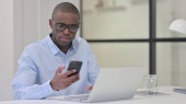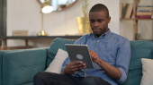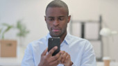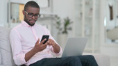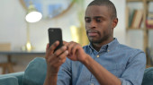 Poważny Młody Afrykanin za pomocą smartfona na kanapie