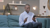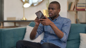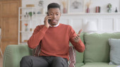 Młody Afrykanin rozmawiający na smartfonie na kanapie