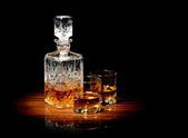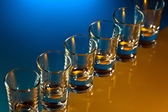 butelka z wielu szklanki wódki na białym tle na czarnym tle