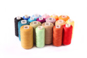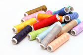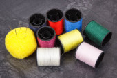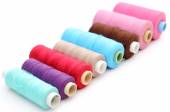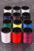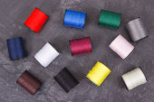 kolorowe szpule nici, taśmy mierniczej i przyciski