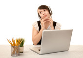 młoda kobieta w okularach siedzący przy stole notatek w dokumentach. Seria nowoczesnych, przestronnych biuro.