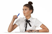 młoda kobieta w okularach siedzący przy stole notatek w dokumentach. Seria nowoczesnych, przestronnych biuro.