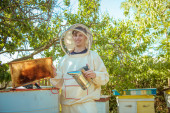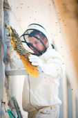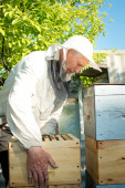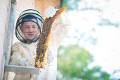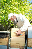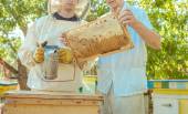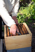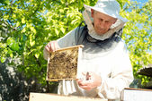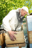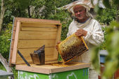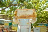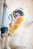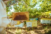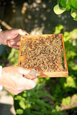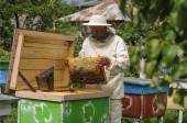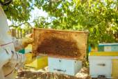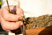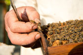 Pszczelarz sprawdza uli. rama z pszczoły.