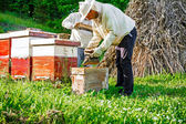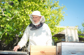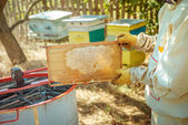Pszczelarz sprawdza uli. rama z pszczoły.