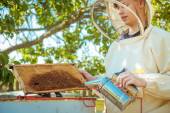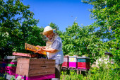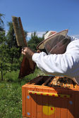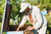 Pszczelarz sprawdza uli. rama z pszczoły.