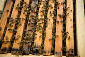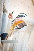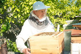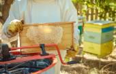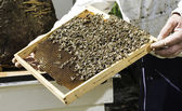 Pszczelarz sprawdza uli. rama z pszczoły.