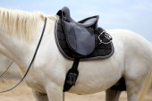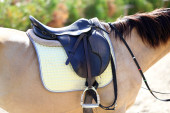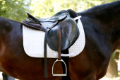 Zdjęcie "Na grzbiecie konia na wierzchu nosi się brązowe skórzane siodło i obrus. Światło słoneczne gotowe do treningu jeździeckiego na świeżym powietrzu" może być wykorzystywane do celów osobistych i komercyjnych zgodnie z warunkami zakupionej licencji Royalty-free. Obraz jest dostępny do pobrania w jakości wysokiej rozdzielczości do 5760x3840.