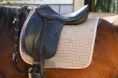 Na grzbiecie konia na wierzchu nosi się brązowe skórzane siodło i obrus. Światło słoneczne gotowe do treningu jeździeckiego na świeżym powietrzu