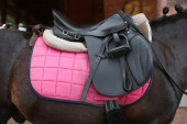 Na grzbiecie konia na wierzchu nosi się brązowe skórzane siodło i obrus. Światło słoneczne gotowe do treningu jeździeckiego na świeżym powietrzu