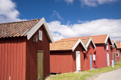 Małe drewniane czerwone domy z wieżą kościelną w tle w miejscowości Gammelstad w północnej Szwecji. Cały drewniany wieniec jest zabytkiem UNESCO..