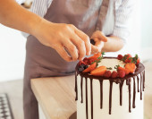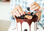 kobieta jest dekorowanie ciasto z czekolady, ręce do góry