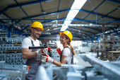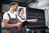 Operatorzy maszyn drukarskich sprawdzają jakość graficzną i wartości kolorów w drukarni.