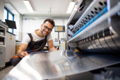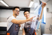 Operatorzy maszyn drukarskich sprawdzają jakość graficzną i wartości kolorów w drukarni.