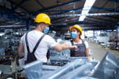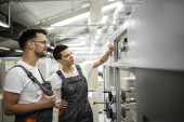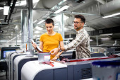 Operatorzy maszyn drukarskich sprawdzają jakość graficzną i wartości kolorów w drukarni.
