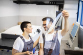 Pracownik drukarni kontrolujący jakość procesu drukowania i sprawdzający kolory szkłem powiększającym.