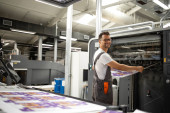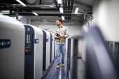 Portret profesjonalnego grafika lub inżyniera sprawdzającego wartości kolorystyczne i farbę na nowoczesnej maszynie drukarskiej.