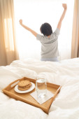 Zdjęcie "Uśmiechnięta kobieta budzi się w łóżku i rozciąga ramiona" może być wykorzystywane do celów osobistych i komercyjnych zgodnie z warunkami zakupionej licencji Royalty-free. Obraz jest dostępny do pobrania w jakości wysokiej rozdzielczości do 5760x3840.