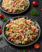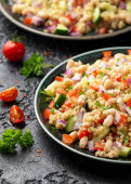 Sałatka z białej fasoli z pomidorami wiśniowymi, ogórkiem, czerwoną cebulą i ziołami. Zdrowe wegańskie jedzenie