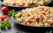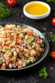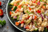 Sałatka z białej fasoli z pomidorami wiśniowymi, ogórkiem, czerwoną cebulą i ziołami. Zdrowe wegańskie jedzenie