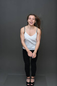 Fotografia w pełnym wzroście na szarym tle biały uroczy młoda dziewczyna z trzepoczącymi włosami w białej bluzce