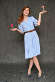 Pełna długość zdjęcie kaukaskie słodkie młoda dziewczyna z trzepotanie włosy w niebieskiej sukience