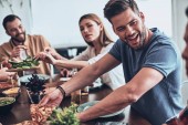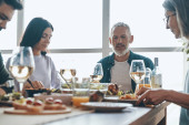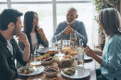 Uśmiechnięta wielopokoleniowa rodzina komunikująca się podczas wspólnej kolacji