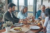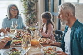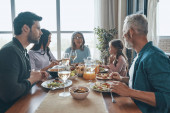 Zdjęcie "Nowoczesna rodzina komunikuje się i uśmiecha podczas wspólnej kolacji" może być wykorzystywane do celów osobistych i komercyjnych zgodnie z warunkami zakupionej licencji Royalty-free. Obraz jest dostępny do pobrania w jakości wysokiej rozdzielczości do 5760x3840.