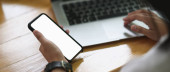 Close up widok businesswoman siedzi w biurze i za pomocą telefonu komórkowego.