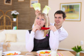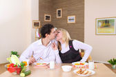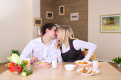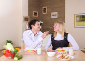 Młoda para zakochanych w domu jedzenie razem i zabawy