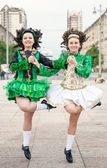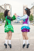 młoda kobieta w stroju tańca irlandzkiego, siedząc na ławce