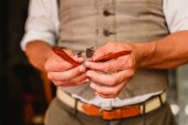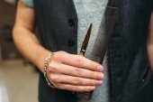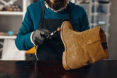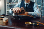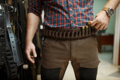 Brodatego myśliwego kupującego skórzaną opaskę w sklepie z bronią. Wnętrze sklepu z bronią, karabiny i asortyment amunicji, wybór broni palnej, strzelanie hobby i styl życia