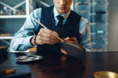 Zdjęcie "Brodatego myśliwego kupującego skórzaną opaskę w sklepie z bronią. Wnętrze sklepu z bronią, karabiny i asortyment amunicji, wybór broni palnej, strzelanie hobby i styl życia" może być wykorzystywane do celów osobistych i komercyjnych zgodnie z warunkami zakupionej licencji Royalty-free. Obraz jest dostępny do pobrania w jakości wysokiej rozdzielczości do 5760x3840.