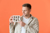Przystojny młody człowiek ze smaczną czekoladą na tle koloru