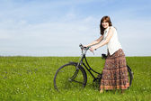 ragazza rossa in abito blu con rosso bicicletta nel parco.