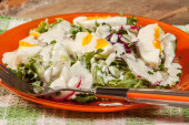 Zdjęcie "Sałatka z jaj, rzodkiewki i ogórek." może być wykorzystywane do celów osobistych i komercyjnych zgodnie z warunkami zakupionej licencji Royalty-free. Obraz jest dostępny do pobrania w jakości wysokiej rozdzielczości do 5760x3840.