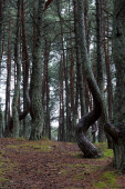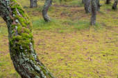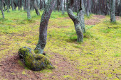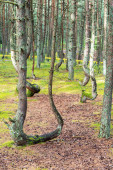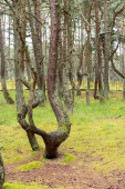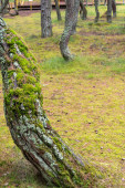 Obraz tańczącego lasu na Mierzei Kurońskiej w obwodzie kaliningradzkim w Rosji. Koncepcja rezerwatu i bogactwo naturalne lasu.