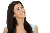 portret młodej kobiety w turkus koszuli uśmiecha i szukam