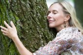 Szczęśliwa młoda kobieta w embrassing jesienne drzewa.