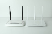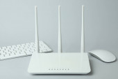 Zdjęcie "Miejsce pracy z routerem Wi - Fi na szarym tle" może być wykorzystywane do celów osobistych i komercyjnych zgodnie z warunkami zakupionej licencji Royalty-free. Obraz jest dostępny do pobrania w jakości wysokiej rozdzielczości do 5760x3840.