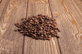 Czarne ziarna kawy leżą na brązowym drewnianym stole