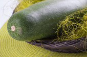 Na zdjęciu trzy dojrzałe cukinie leżące na stole..