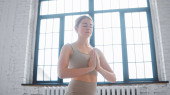 Szczupła młoda kobieta praktykująca jogę w jasnoszarym dresie siedzi na macie w lotosowej pozycji medytującej