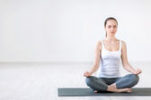 Skoncentrowana kobieta z zamkniętymi oczami w beżowej bluzce modli się trzymając się za ręce w pozycji do jogi namaste mudra by chest in studio