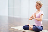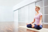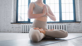 Skoncentrowana młoda kobieta w wygodnym dresie medytuje z namaste mudra na treningu w przestronnym studio jogi z bliskim widokiem