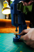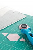 szczegół kobieta ręce cięcia tkaniny z mozaiki obrotowy nóż