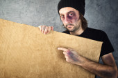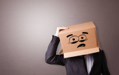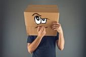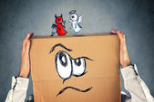 człowiek z kartonu na głowie i przerażony wygląd skethed