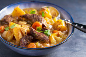 Zdjęcie "Tradycyjne i rustykalne gulasz wołowy gotowane z warzyw korzeniowych, marchew i ziemniaki w pysznym sosie. Podawany na talerzu z patelnią w tle. Widok z bliska" może być wykorzystywane do celów osobistych i komercyjnych zgodnie z warunkami zakupionej licencji Royalty-free. Obraz jest dostępny do pobrania w jakości wysokiej rozdzielczości do 5760x3840.