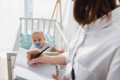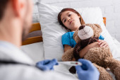Zdjęcie "Niewyraźny pediatra trzymający strzykawkę w pobliżu matki i dziewczynki w maskach medycznych " może być wykorzystywane do celów osobistych i komercyjnych zgodnie z warunkami zakupionej licencji Royalty-free. Obraz jest dostępny do pobrania w jakości wysokiej rozdzielczości do 5760x3840.