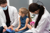 Dzieciak patrzy na uśmiechniętą matkę w pobliżu pediatry ze strzykawką