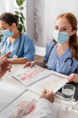 lekarz patrząc na prześwietlenie płuc w pobliżu chorej kobiety w masce medycznej